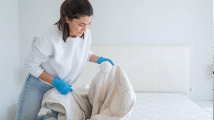 Uyurken yorgan ve çarşafların ortasında ter ve nem birikebilir. Bu yüzden, sabah kalktığınızda yatağınızı çabucak toplamayın. Yorgan ve çarşafları bir müddet açık bırakın, böylelikle nemin buharlaşmasına müsaade verin. Çarşafları haftada bir sefer yıkamak ve yorganları tertipli olarak havalandırmak da küf oluşumunu mahzurlar. Şayet yatağınızda esasen küf kokusu fark ettiyseniz, çarşafları sıcak suyla yıkayın.